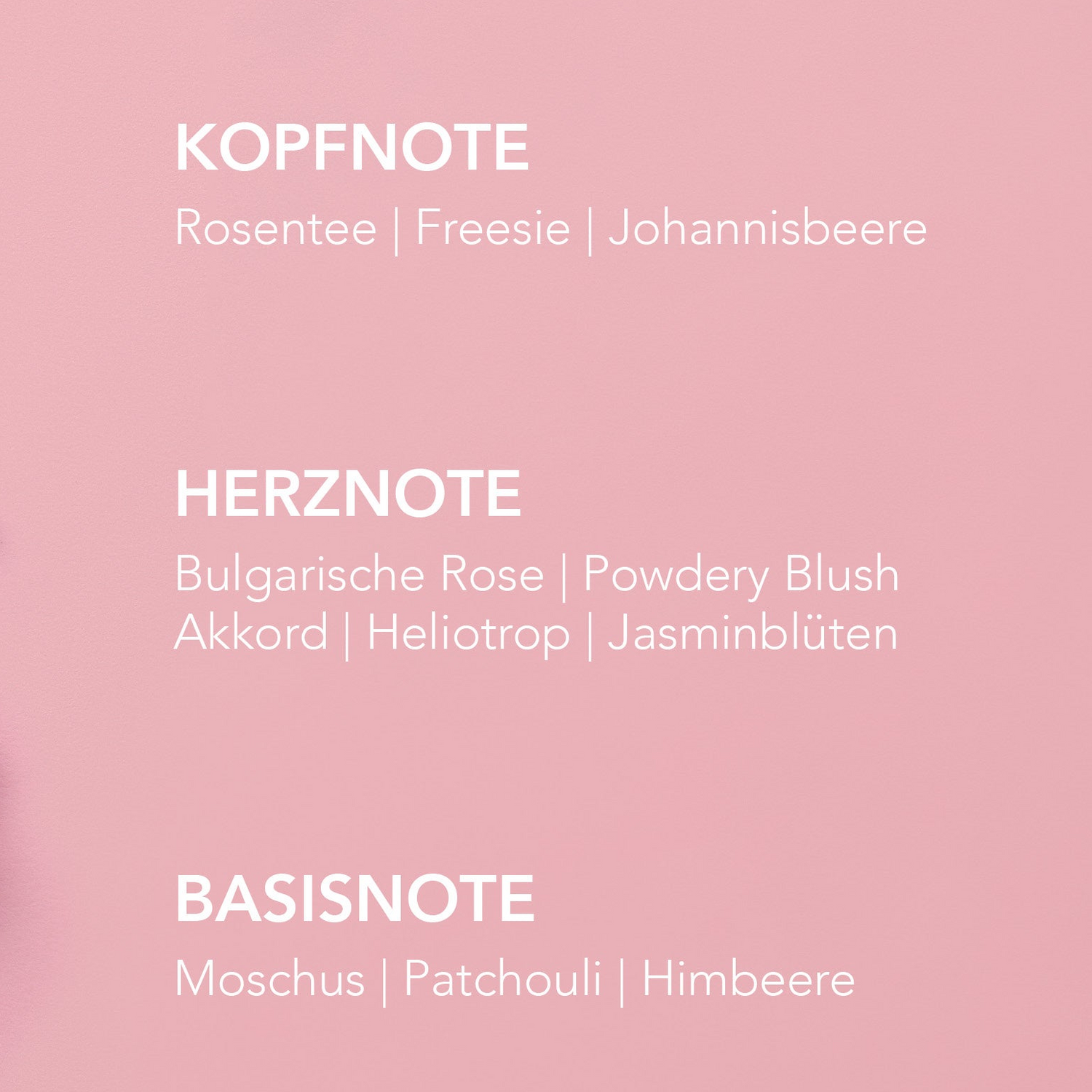 Betty Barclay BLUSH eröffnet mit der spritzig-frischen Kombination aus Rosentee, Freesie und Schwarzer Johannisbeere – ein lebendiger Auftakt voller Energie. Im Herzen entfaltet sich die volle Blüte: Bulgarische Rose, ein pudrig-weicher Blush-Akkord, Heliotrop und Jasminblüten verleihen dem Duft feminine Eleganz. Die Basisnote sorgt mit Moschus, Patschuli und der fruchtigen Süße von Himbeere für eine sanft umhüllende Tiefe.